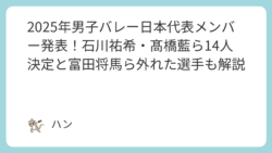 エンタメ 2025年男子バレー日本代表メンバー発表!石川祐希・髙橋藍ら14人決定と富田将馬ら外れた選手も解説 2025年男子バレー世界選手権に挑む日本代表14人が発表されました。石川祐希、大塚達宣、髙橋藍ら主力が順当に選出。一方で、富田将馬をはじめ注目選手が外れる結果に。選考の背景や今後の展望を徹底解説します。 2025.09.13 エンタメ
